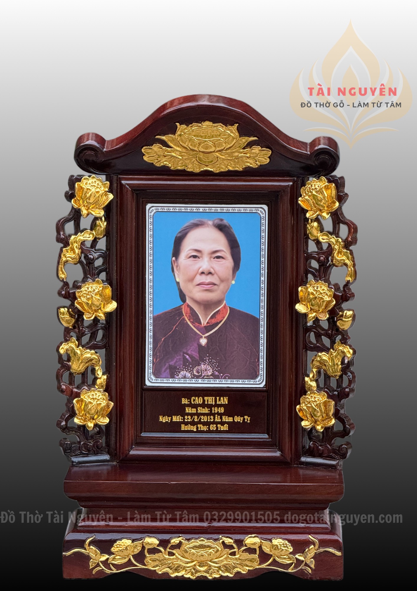 Bài vị đục hoa sen Kích thước: cao 50 rộng 30cm Chất liệu: gỗ hương Ảnh men sứ cao 20 rộng 13cm Tư vấn: 0329901505 hoặc 0989468189