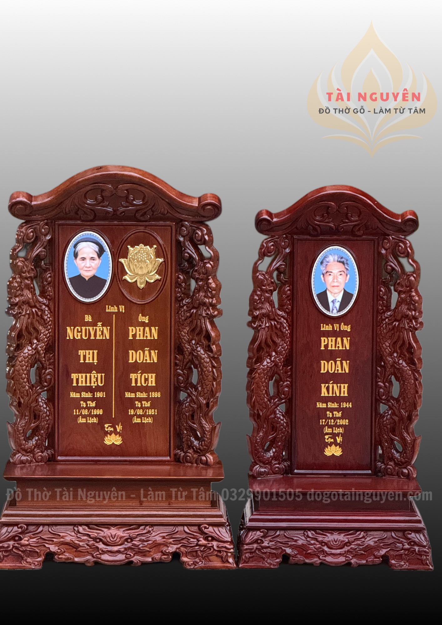 Bài vị song long, đục chạm rồng tinh tế Chất liệu: gỗ hương Kích thước: điều chỉnh theo yêu cầu Kích thước tham khảo: Mẫu đơn cao 50 rộng 23/ Mẫu đôi cao 50 rộng 30 Tư vấn: 0329901505 hoặc 0989468189
