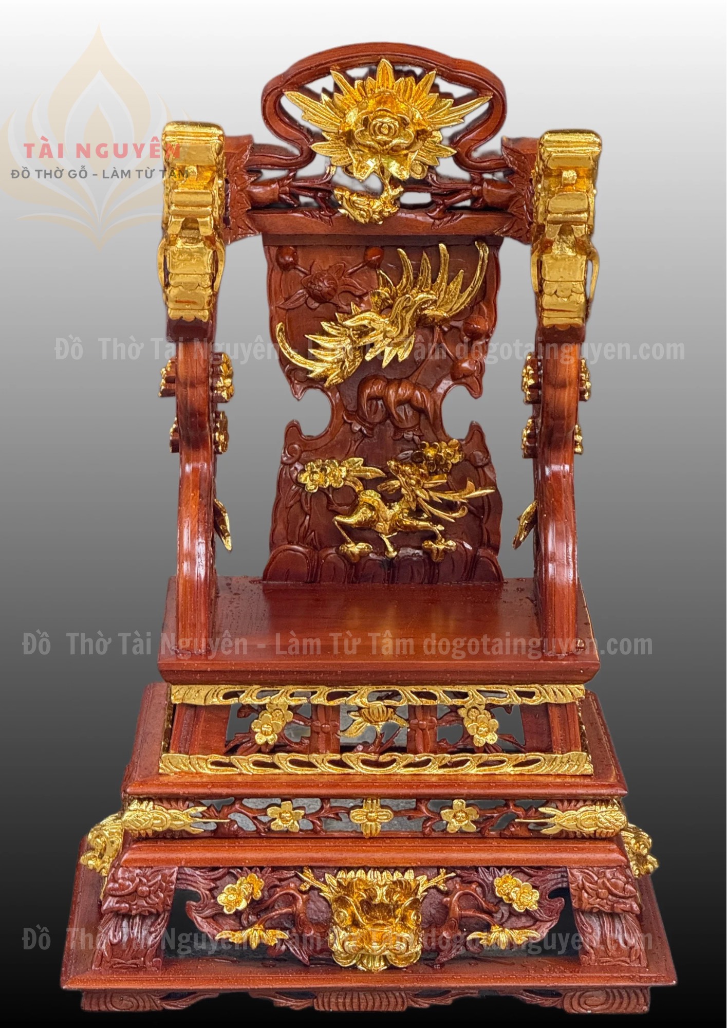 Với họa tiết rồng phượng và hoa sen, mẫu ngai này không chỉ đẹp về hình thức mà còn mang ý nghĩa cầu phúc – cầu lộc – cầu bình an cho gia đình, dòng họ.