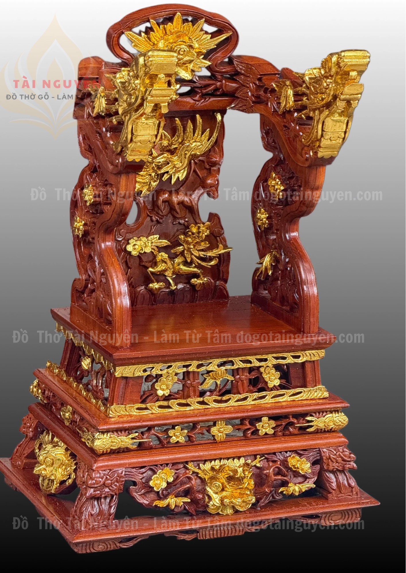 • Chân và bệ ngai: nhiều tầng, chạm nổi hoa văn tứ quý, kết hợp nhũ vàng tạo nên vẻ bề thế, chắc chắn.